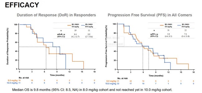 HS-20093ÔÚ53ÀýÖׯÀ»¼ÕßÖУ¬£¬£¬£¬£¬8.0mg/kg¼ÁÁ¿×éµÄORRΪ61.3%¡¢DCRΪ80.6%¡¢mDORΪ6.4¸öÔ¡¢mPFSΪ5.9¸öÔ¡¢mOSΪ9.8¸öÔµ«95%ÖÃÐÅÇø¼ä£¨CI£©µÄÉÏÏÞÈÔÈ»ÊÇ¡°·Ç¿É´ï¡±£¨NA£©£¬£¬£¬£¬£¬Õâͨ³£Òâζ×ÅÊý¾ÝÉÐδÍêÈ«³ÉÊ죬£¬£¬£¬£¬ÉÐÓÐÔöÌíµÄ¿ÉÄÜÐÔ¡£¡£¡£¡£¡£¡£¡£¡£10.0mg/kg¼ÁÁ¿×éµÄORRΪ50.0%¡¢DCRΪ95.5%¡¢mDORΪ8.9¸öÔ¡¢mPFSΪ7.3¸öÔ£¨Î´³ÉÊ죩¡¢mOSÉÐδµÖ´ï¡£¡£¡£¡£¡£¡£¡£¡£
