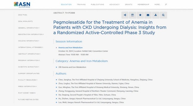 ¡¾2¡¿Chen Jianghua,et al.Pegmolesatide for the Treatment of Anemia in Patients with CKD Undergoing Dialysis: Insights from a Randomized Active-Controlled Phase 3 Study. ASN 2024. ABSTRACT: TH-PO888